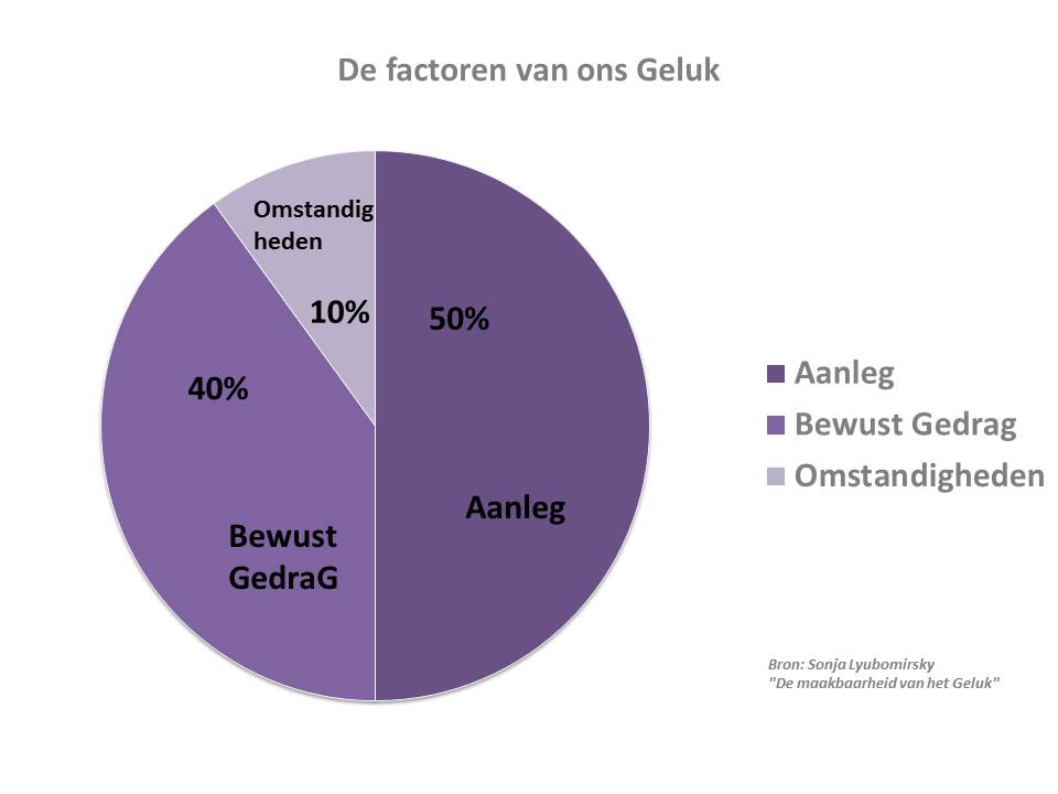 Het is zo, dat Geluk voor 50% al bepaald is bij de geboorte, maar maak gebruik van de 40%  bewust gedrag die je tot je beschikking hebt!
